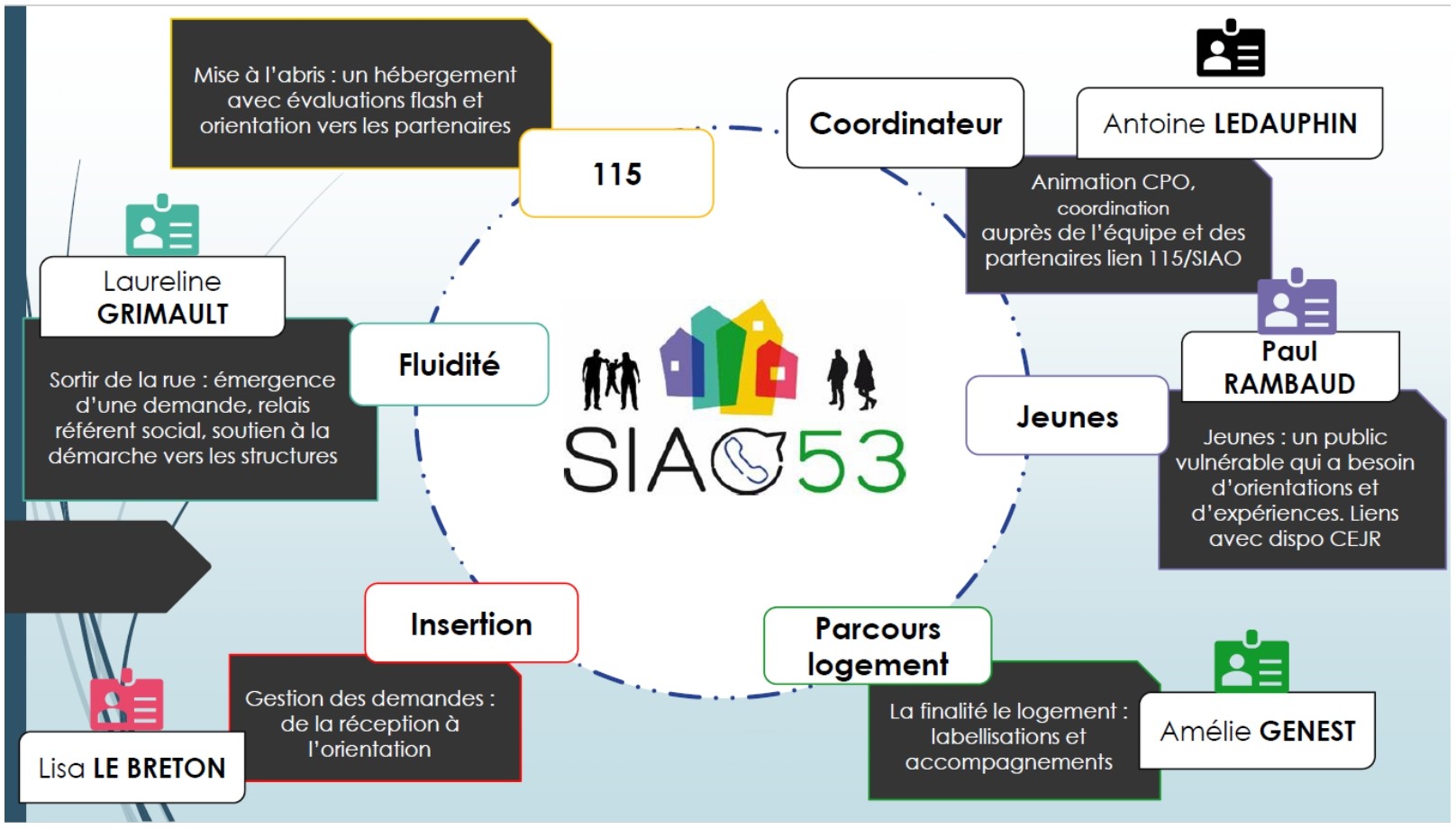 –Référent jeunes SIAO => accompagnement spécifique de jeunes en rupture afin de leur proposer des possibilités d’orientations (hébergement, logement, mission locale…)
